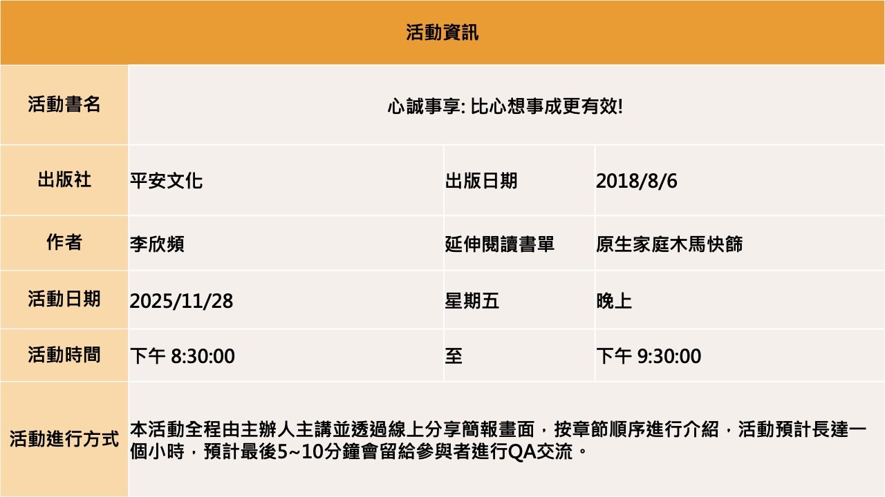 【線上直播】心誠事享: 比心想事成更有效!
