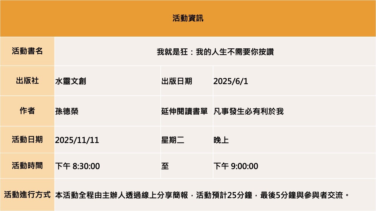 • 基於個人隱私考量,報名者如不願公開肖像與個人資料,可於活動中選擇不開啟畫面鏡頭或以暱稱取代真實姓名以為因應,但不得以拒絕主辦者錄音、錄影與檔案留存為由禁止、干預或阻撓主辦者執行,如參加者不同意配合者請勿報名本活動;已報名者,如因拒絕配合而退出活動或取消出席,本平台恕不提供任何退費與賠償,感謝您的配合。