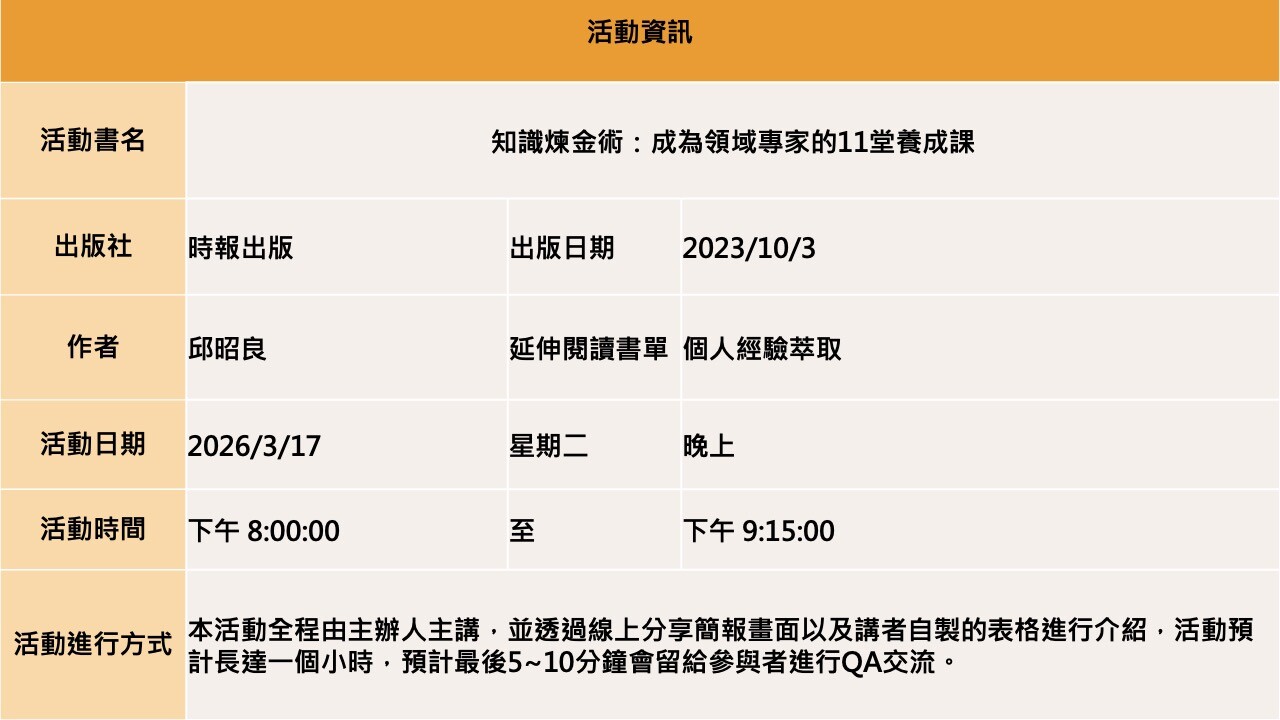 【線上直播】知識煉金術:成為領域專家的11堂養成課