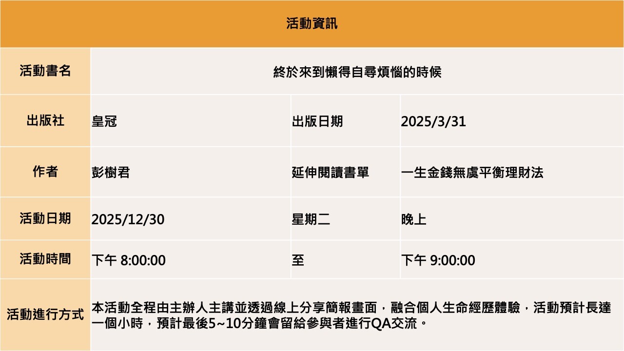 - 如為線上活動,系統將於活動開始前1小時,提供Zoom連結,屆時請至首頁選單處[我的帳戶]–[帳戶登入]-點選[我的訂單]或[預約管理]進行查詢並直接點選[連結]登入。