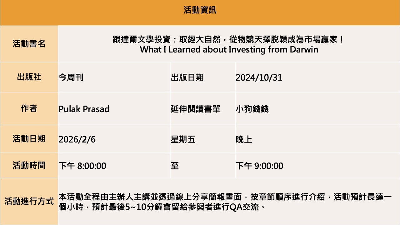 【線上直播】跟達爾文學投資:取經大自然,從物競天擇脫穎成為市場贏家!