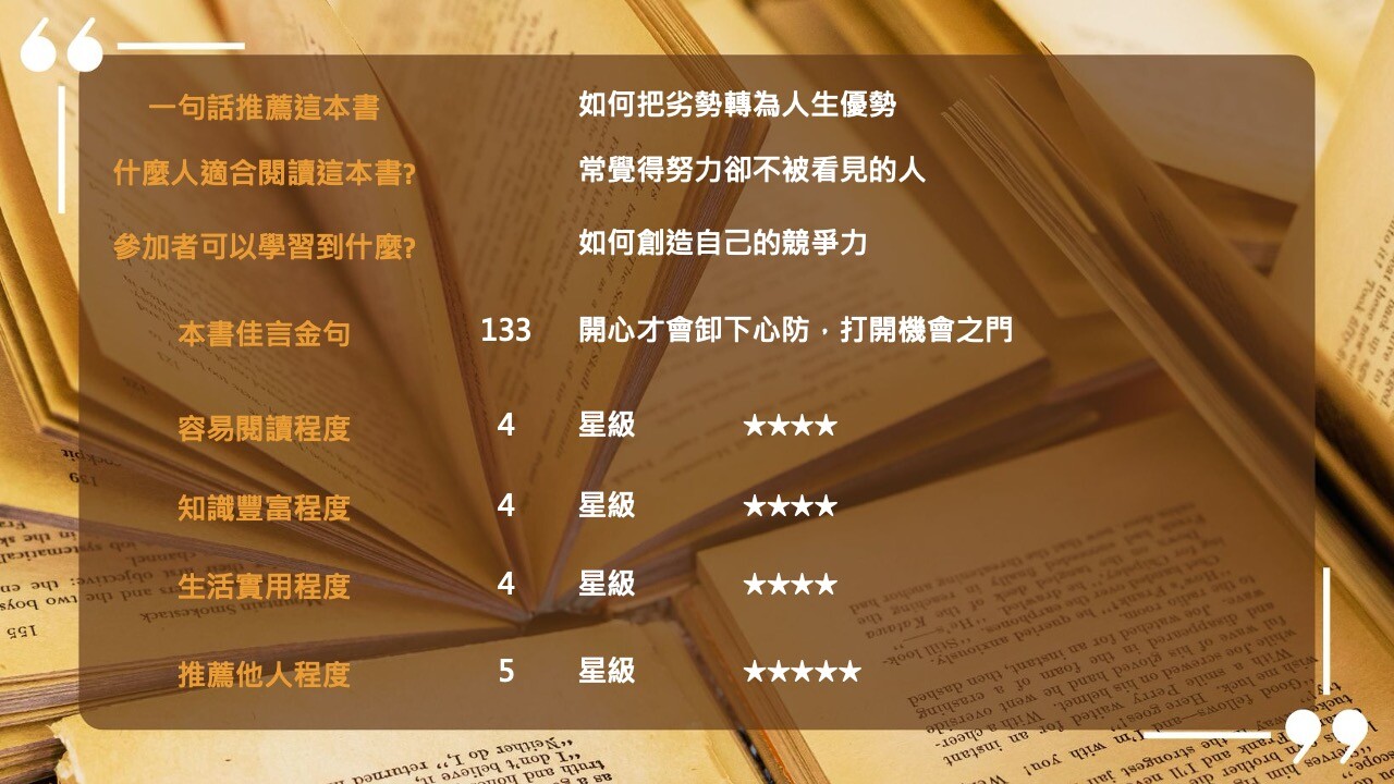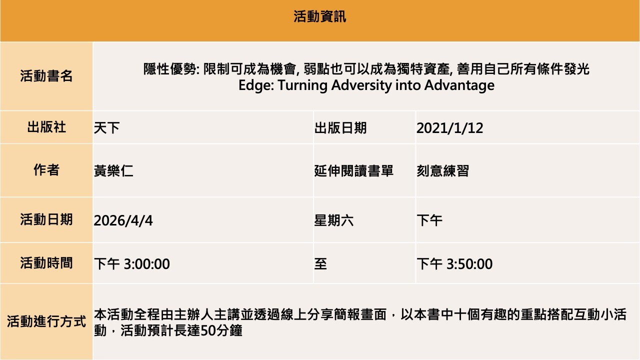 【線上直播】隱性優勢: 限制可成為機會, 弱點也可以成為獨特資產, 善用自己所有條件發光